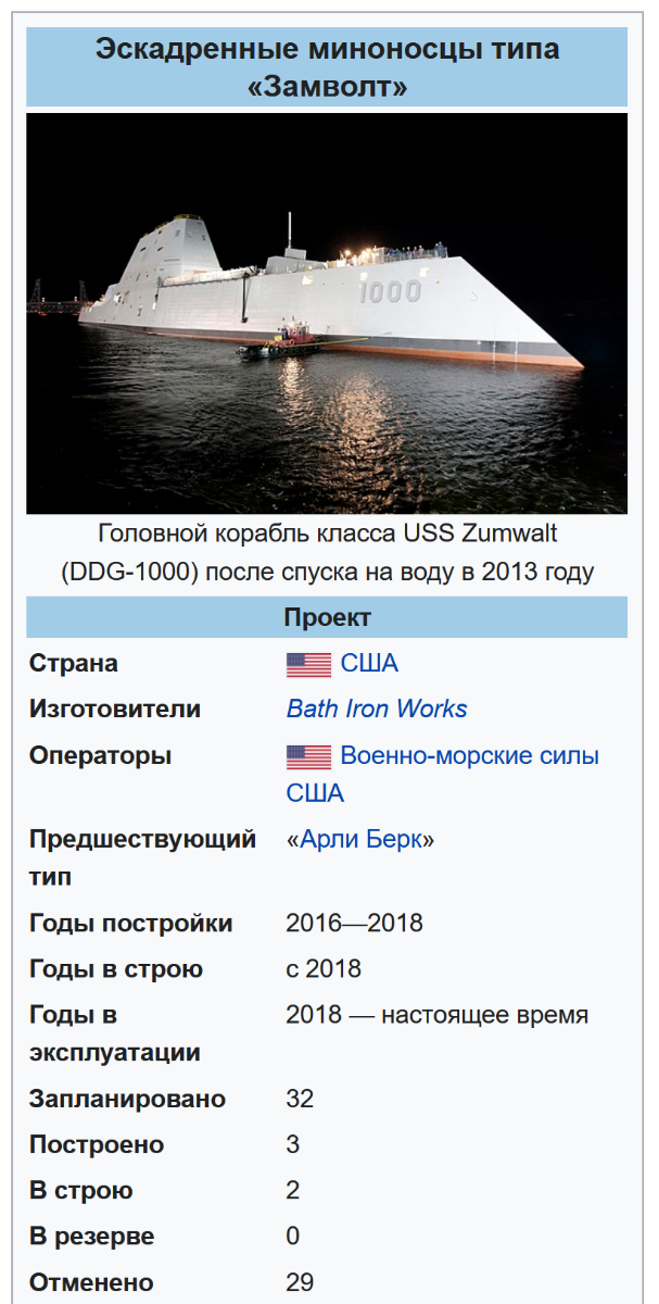 Немного подробнее рассмотрим эсминцы класса Zumwalt, поскольку они того определённо стоят (один корабль обошёлся американским налогоплательщикам в 4,4 миллиарда долларов). Эсминцы данного класса разрабатывались для поражения наземных сил противника, огневой поддержки с моря высадки морского десанта, и противодействию авиации противника. Особенностью корабля стала почти полная автоматизация, что позволило сократить экипаж до 140 человек. Изначально планировалось построить 32 таких эсминца, но удовольствие оказалось слишком дорогим даже для США. В итоге было создано всего 3 судна.