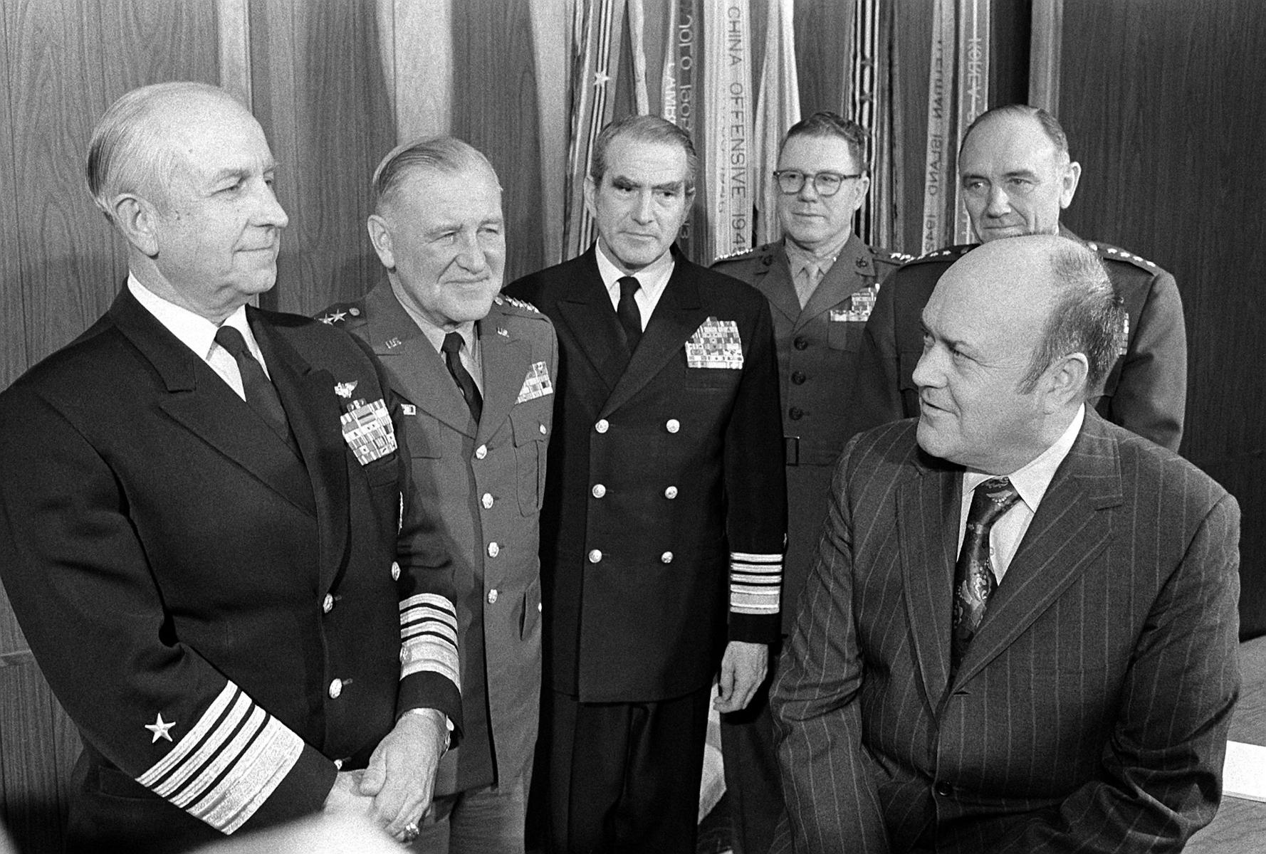 Элмо Замволт (в середине) на встрече с членами Объединённого комитета начальников штабов: Томасом Х. Мурером, Крейтоном Абрамсом, Робертом Э. Кашмэном-младшим, Джоном Д. Райаном и министром обороны Мелвином Р. Лейрдом, 1973.