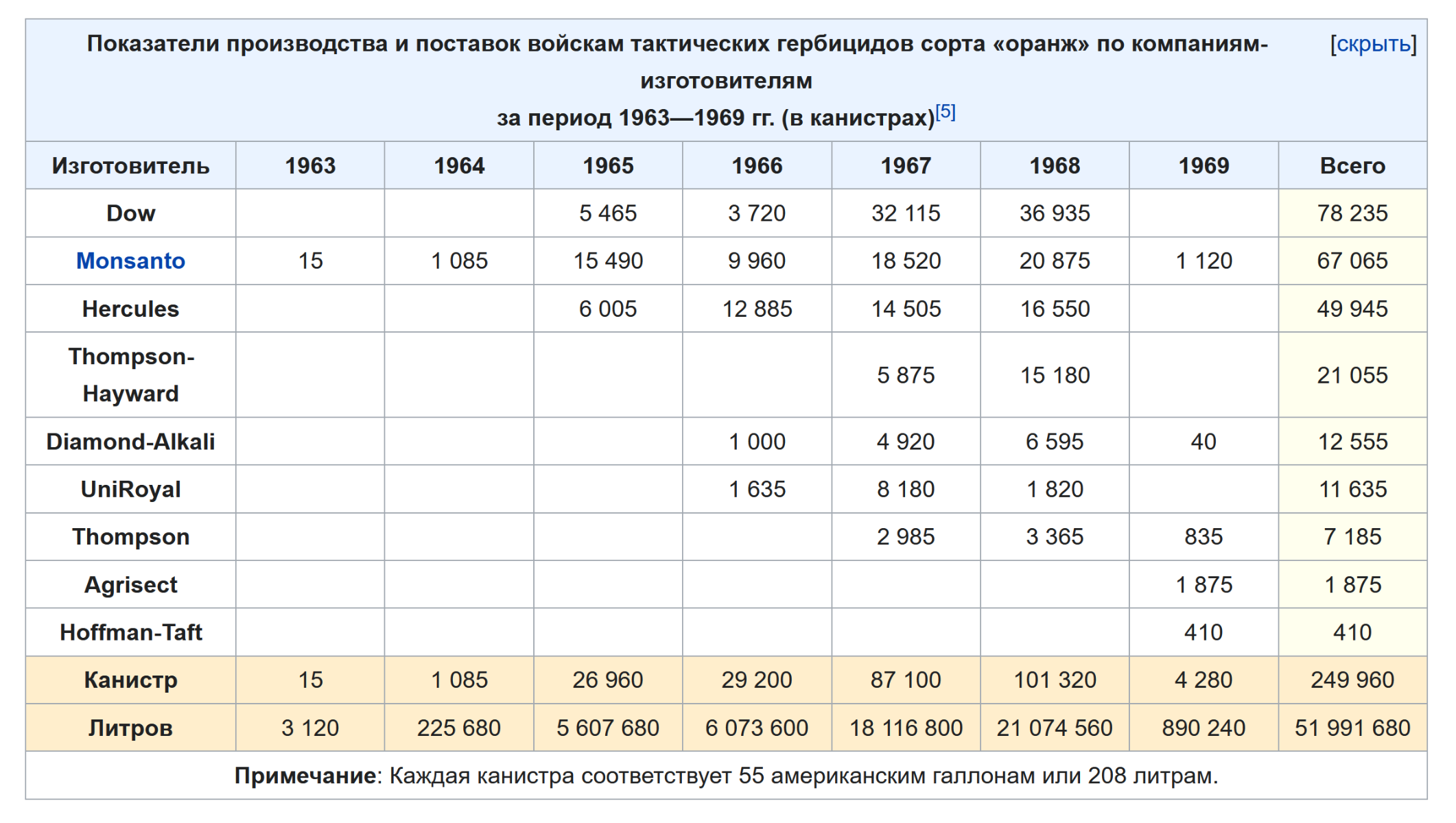 Разработкой финального химического соединения, готового для тактического применения занималась корпорация «Дюпон». Она же получила и первые контракты на поставки тактических гербицидов, вместе с компаниями «Монсанто» и «Доу Кемикэл». (Корпорация «Монсанто» фигурирует в научно-фантастических книгах российского писателя Сергея Тармашева, как главный поставщик генномодифицированных продуктов, спровоцировавших чудовищную генетическая катастрофу. Книги «Наследие» и «Наследие 2»).
