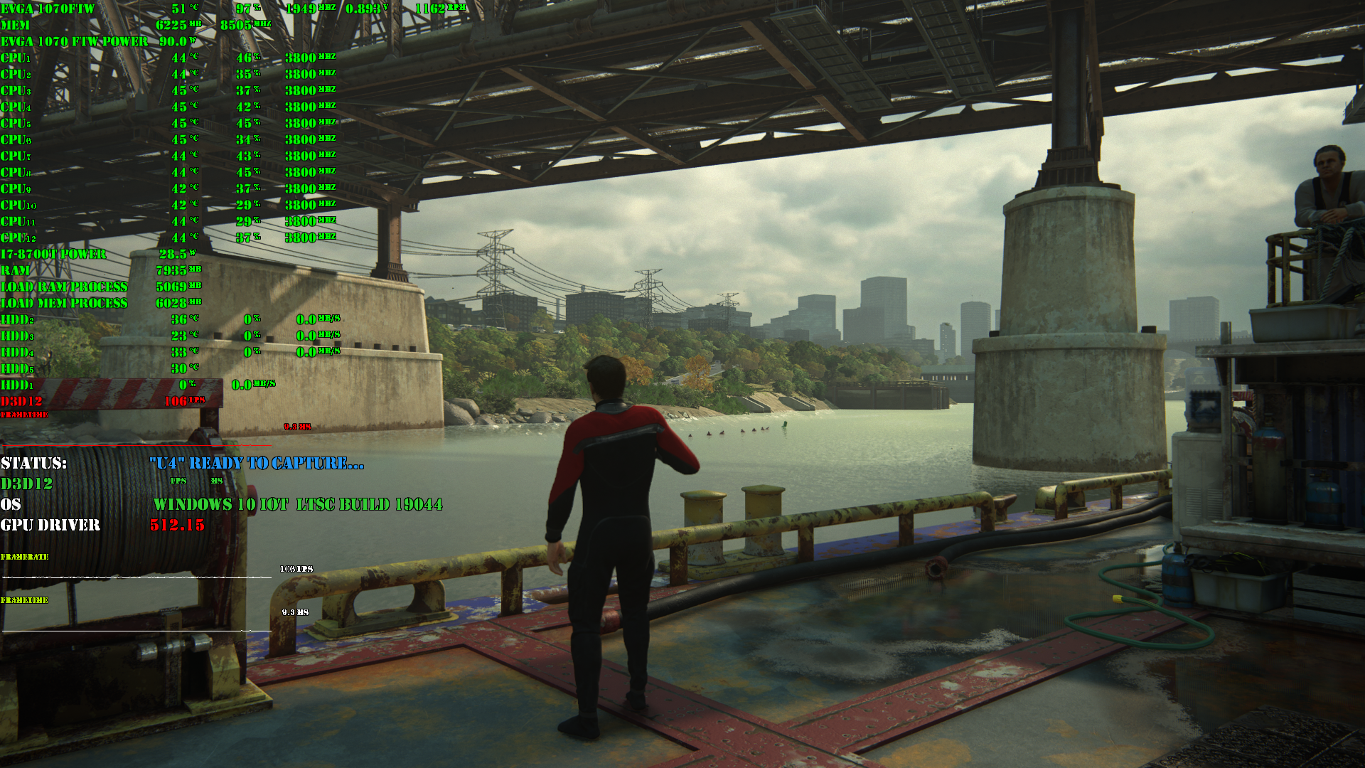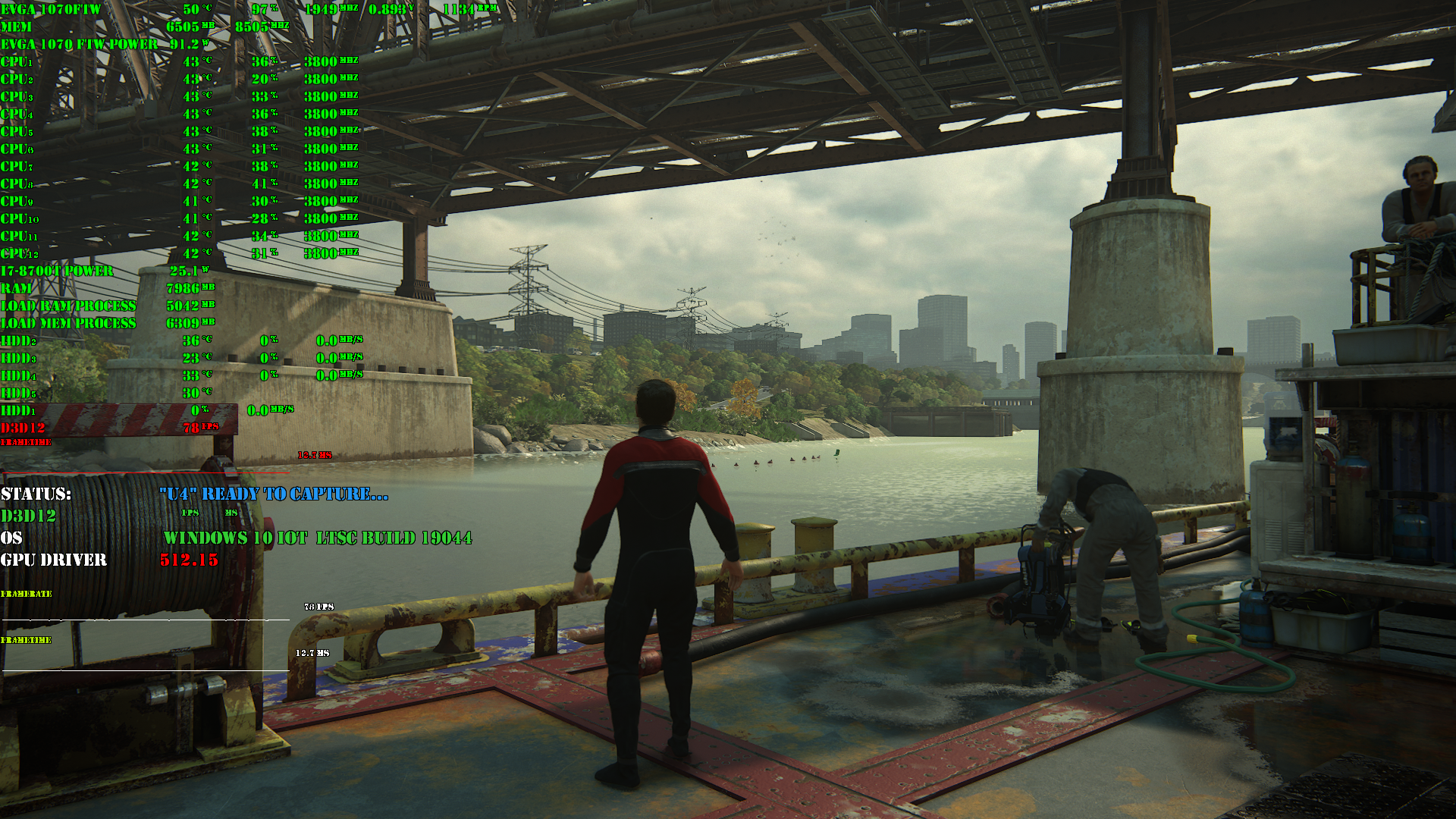 Фреймтайм уже показывает, что уровень частоты кадров крайне нестабилен. Это потому, что при перемещении в закрытые локации (всякие сараи и тому подобное), фпс растет.