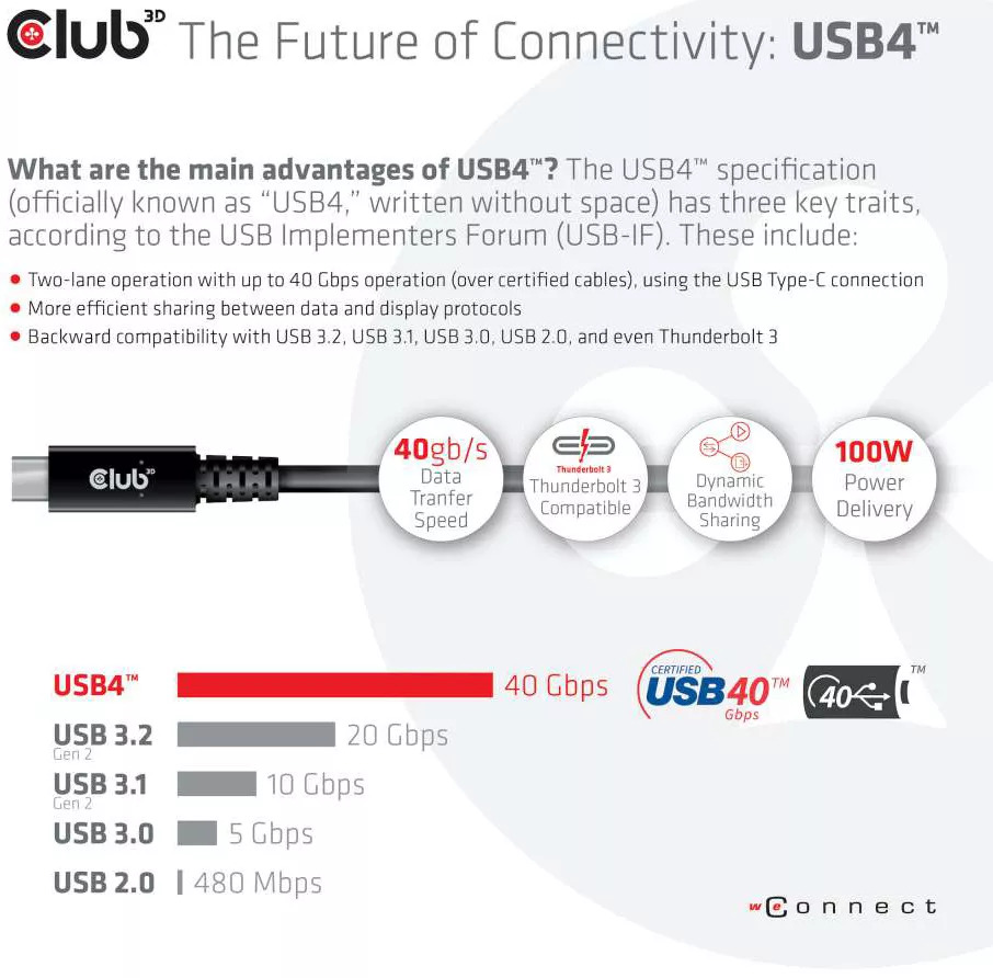 Компания Club 3D одна из первых анонсировала кабель USB 4, который поддерживает все технологии стандарта со скоростью передачи до 40 Гбит/с, расширенные режимы, а также мощность зарядки 100 Вт. Разработчики стандарта USB готовят 2 программы сертификации стандарта USB 4 , которые предлагают возможности передачи по кабелю со скоростью до 20 и 40 Гбит/с.