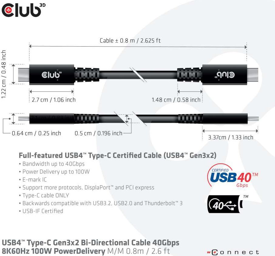 Кабель Club 3D USB4 CAC-1571 оснащен с микросхемой E-mark, которая предлагает возможности кабеля для различных устройств, включая хосты, зарядные устройства и концентраторы. Хотя компания Club 3D представила кабель USB 4 CAC-1571 на своем веб-сайте, но еще не приступила к поставкам и неизвестна цена кабеля.