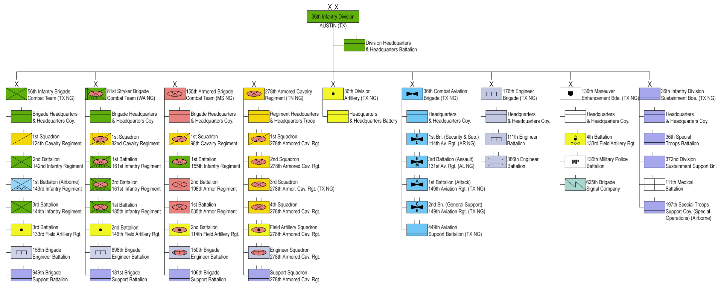 Самой боеспособной частью Армии Национальной гвардии штата Техас по праву и по размерам является 36-я пехотная дивизия, имеющая точно такое же прозвище «Texas Division» и ряд других неофициальных названий. Сформирована в 1918 году и успела принять участие в большинстве крупнейших вооруженных конфликтов Новейшего времени: Первой Мировой (операция в Мёз-Аргонн), Второй Мировой (шесть операций), Иракской и Афганских военных кампаниях, борьбе с терроризмом. А также участвовала в борьбе с пандемией COVID-19 и противодействовала беспорядкам, организованным в результате задержания Джорджа Флойда.
