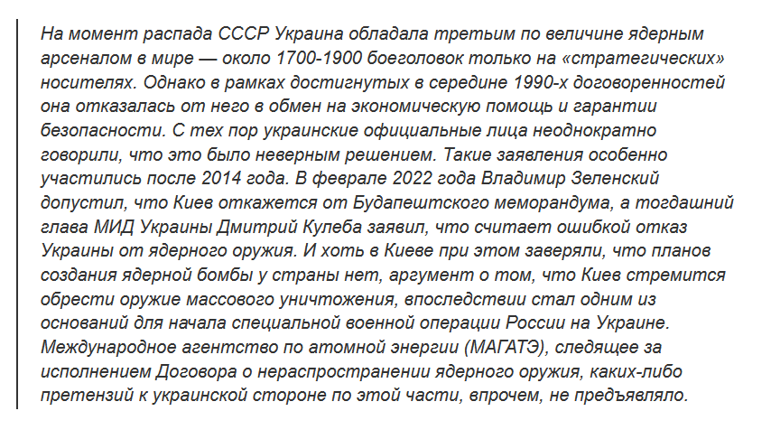 Б) Как рассказал ученый Центра изучения стратегического планирования Илья Крамник, создание фабрик для получения оружейных компонентов ядерного оружия по силам только промышленно развитым государствам, и это при условии тотальной внешней безопасности. После этого в период от 5 до 10 лет можно будет говорить о появлении необходимого количества обогащенного урана и оружейного плутония. А теперь возьмем текущую ситуацию с Украиной: оная сражается с Россией, а её экономический потенциал весьма далёк от условий начала 1991 года, когда Киев буквально был одним из лидеров промышленного производства с большим количеством действующих крупных заводов, профильных институтов и глубоким научным потенциалом. Сегодняшняя Украина лишь тень своего условного величия.