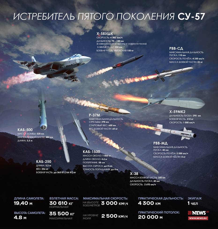 - Су-57 несет полный боекомплект современных ракет класса «воздух-воздух» – Р-77-1, Р-37М и Р-74М и «воздух-поверхность» – это ракеты Х-59МК2 и их позднейшая ревизия Х-69.