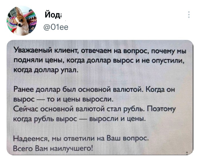 Рубль вроде бы как укрепляется - таких цена на иностранную валюту как сейчас, пожалуй не было уже лет так 5ть. Но что мы видим? Цены неуклонно ползут тихой сапой вверх. Есть ли этому какое-то рациональное объяснение? Ответа я вам не дам, но у меня для вас есть веселенькая пикча...
