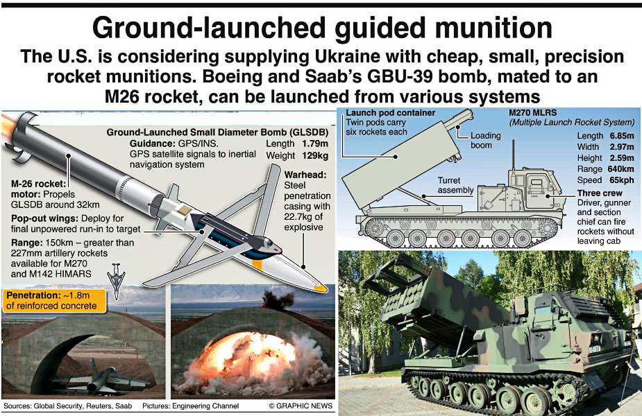 Ground Launched Small Diameter Bomb - есть не что иное, как малоразмерные бомбы "GBU-39/B", парящие как планер, используемые американской авиацией (и не только ей). Но с одним "маленьким нюансом": эти бомбы, ака "котопес", скрещены с другим типом вооружения - реактивным снарядом "М-26". И у нас "на выходе" получается мутант, рожденный в муках кооперации Boeing и что странно - Saab Group, родом из Швеции.