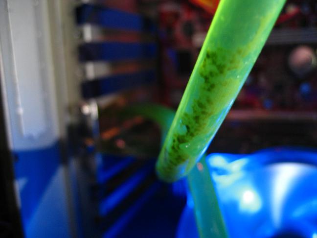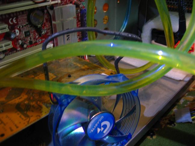Цель поставлена, приступаем (кстати на фотке самый грязный кусок шланга, больше нигде такого нет, а так маленькие черные точки по всем). Залил, выключил все вентиляторе в СВО и загрузил проц (х2 3800), крутил тесты пару часов, температура не поднималась выше 47-49. Грязь с шлангов не исчезала.