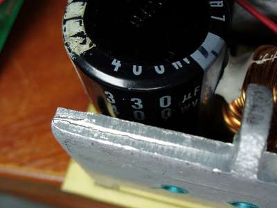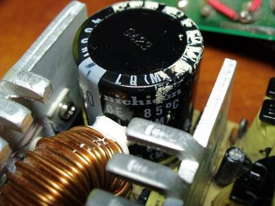 Замена нашлась в том самом PowerMan'е 500W, о котором шла речь выше - там стоят такие же транзисторы, пришлось один оттуда снять. С кондёром труднее, но перекопав весь шкаф с радиодеталями я нашёл в коробке с конденсаторами от распаяных БП один (!!) кондёр, который соответствовал нужной ёмкости и напряжению среди кучи "парных" меньшего напряжения. Зато какой - Nichicon, это что надо в отличие от CapXon. Ёмкостью и напряжением он оказался слегка ниже - 330 мкФ на 400В, но в качестве я думаю он всё же выше CapXon'а.