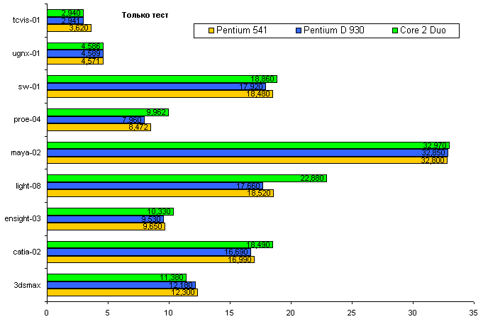 Заметно, что в некоторых случаях результат с процессором Pentium 541 даже выше чем с Core2Duo, но это справедливо только при отсутствии ресурсоемкой задачи выполняемой в фоновом режиме, при наличии такой задачи результаты тестов выстраиваются в логичную последовательность. Внимательные читали наверняка заметили, что при наличии фоновой задачи двуядерные процессоры иногда показывают большую производительность нежели при монопольном выполнении только теста. Видимо это особенность данного пакета.