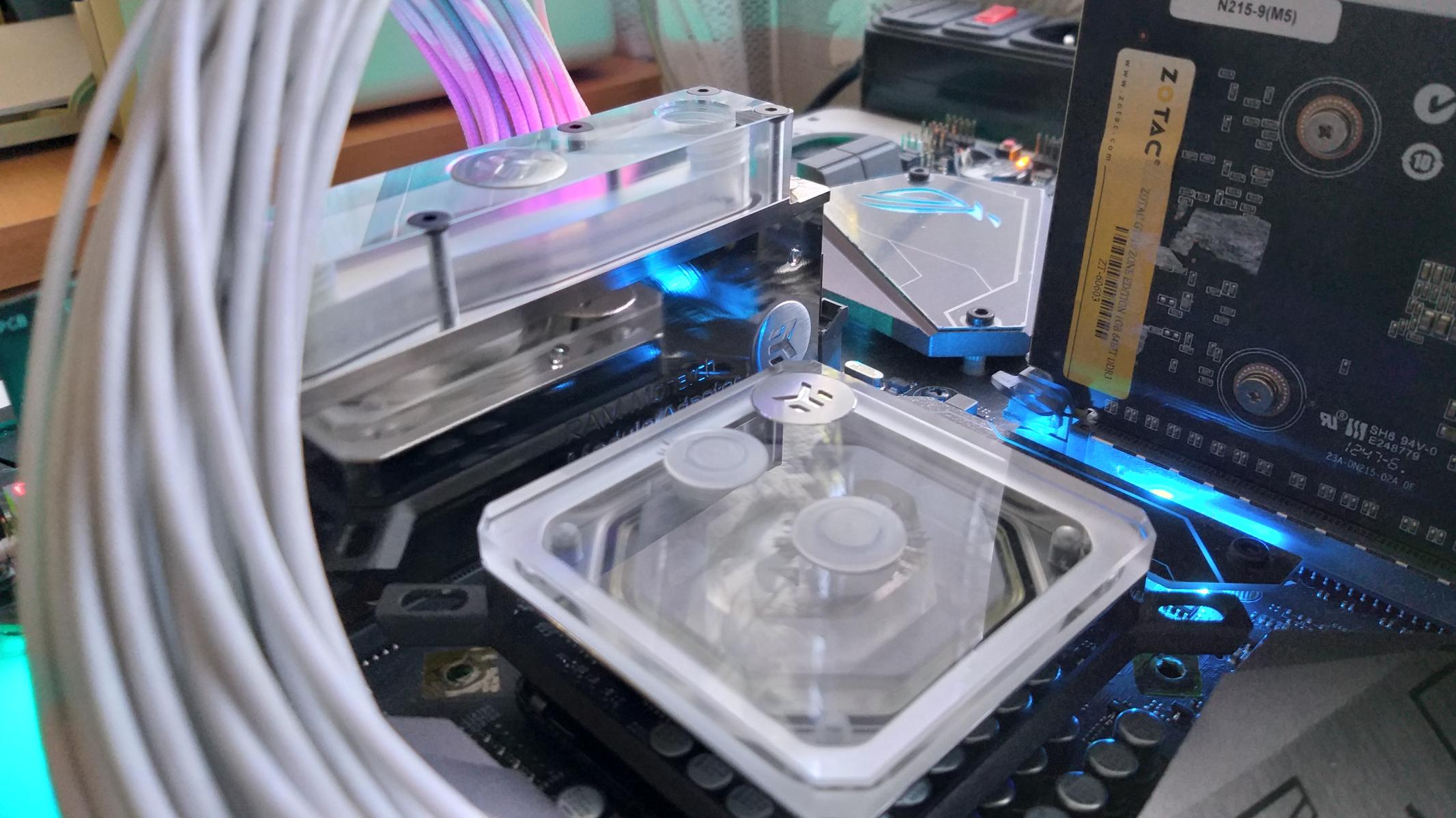 - Система охлаждения: EK-Quantum Velocity (CPU), EK-RAM Monarch (RAM), Bykski WB (M.2 SSD), 2xD5 EKWB помпы в спаренном топе, резервуар EK-RES X3 250, радиаторы EK-CoolStream 480 PE + EK-CoolStream Classic 120 SE, вентиляторы NoiseBlocker eLoop B12-PS