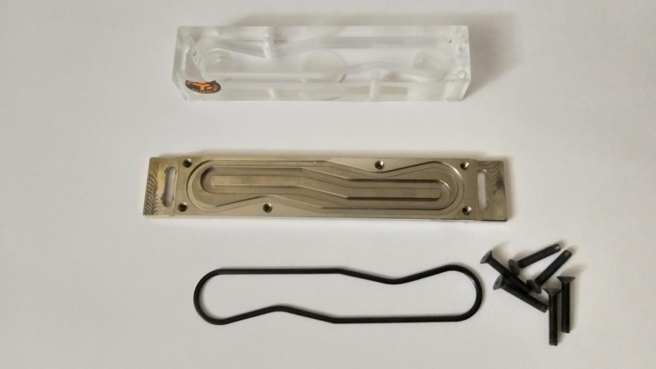 Этот комплект включает в себя сам водоблок, состоящий из медной никелированной пластины и плексигласового топа, а также два никелированных радиатора. Т.е. рассчитан на две установленные вплотную друг к другу плашки. Признаться, вживую это выглядит потрясающе.