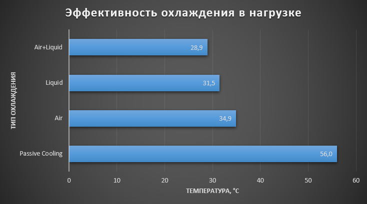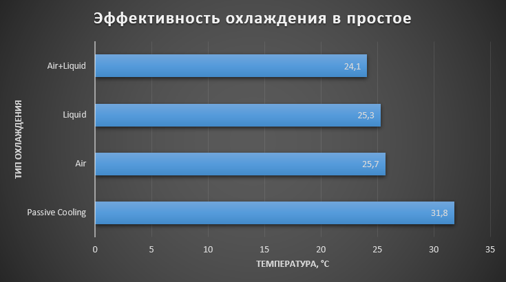 24.1 °C, что ж, это назвать погрешностью уже нельзя, но, как мы видим, в целом, любое дополнительное охлаждение значительно превосходит пассивное, даже в простое. Также для наглядности построим сводную диаграмму: