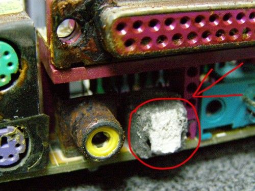 Еще одно замечание по задней панели материнки – крепление разъема COM-порта, выполненное судя по всему из стали, разъело полностью и оно оторвалось еще при мытье платы. Полностью расплавлен оптический выход, а в остальном все осталось по-прежнему, не считая исчезнувшего гальванического покрытия и абсолютного отсутствия блеска.