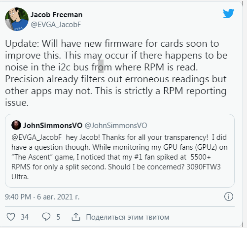 Теперь компания EVGA огласила свою версию. По её мнению причиной неисправности послужили шумы в шине I2C, с которой считывались данные об оборотах. Компания заверила, что видеокарты EVGA скоро получат новую прошивку BIOS, которая решит проблему скачков оборотов вентиляторов. Тем не менее, производитель пока не готов утверждать со 100% уверенностью, что вопрос решен полностью и продолжает анализировать полученные данные. Таким, образом могут быть выпущены и другие обновления. Компания также заверила, что геймеры, использующие программное обеспечение EVGA Precision, защищены от поломки, поскольку данные с шины уже отфильтрованы.