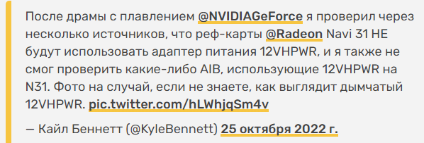 Ресурс Videocardz со ссылкой на твит Кайла Беннетта высказывает предположение, что флагманские модели Radeon Navi 31 не будут использовать разъём питания 12VHPWR (более младшие модели с ещё большей вероятностью). Кроме того, без этого разъёма обойдутся и партнёры компании, отвечающие за выпуск нереференсных моделей.