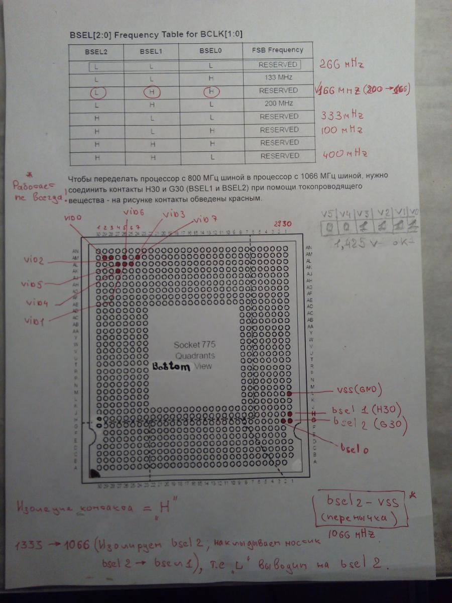 BSEL как и VID можно выполнять разными токопроводящими материалами, такими как фольга, токопроводящий клей или просто паяльник и припой. Я использовал фольгу и белый скотч для изоляции. Не буду томить длительным рассказом, вот фото VID мода на 1,425v (BSEL на 1066 MHz не показан - нужно перебросить H30 и G30). Процессор запустился и работал, но из-за перегрева убогой VRM материнской платы стабильности достичь не удалось, тепловыделение при этом было лютым.