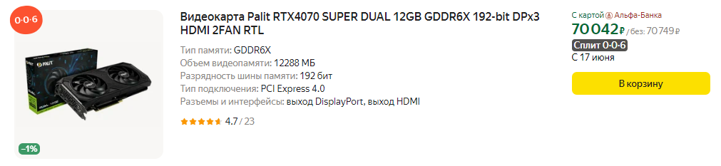 Верхний средний ценовой диапазон $500-600 плотно оккупировали сразу четыре модели: GeForce RTX 4070, GeForce RTX 4070 SUPER, Radeon RX 7800 XT и Radeon RX 7900 GRE. Обычная GeForce RTX 4070 исчезает из продажи, и по соотношению FPS на доллар с треском проигрывает GeForce RTX 4070 SUPER, стоящей практически столько же.