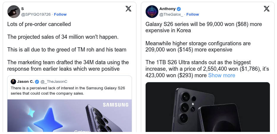 Публикации в сети подтверждают оформившуюся тенденцию. Так, инсайдер Джейсон С. заявил, что наблюдается "заметное отсутствие интереса к серии Samsung Galaxy S26". В то же время другой инсайдер под ником SPYGO19726 в соцсети X (заблокирована в РФ) указал на отмену многими потенциальными покупателями своих предзаказов на новую линейку.