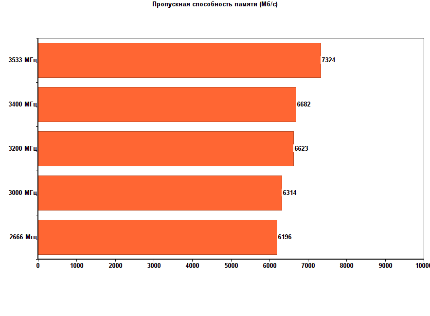 Из этого можно сделать вывод, что пропускная способность двух планок ОЗУ не является узким местом в системе и ограничивающим фактором для того, чтобы сделать ее работу более быстрой. Возможно, в одноканальном режиме разница была бы более существенной. Таким образом, можно ограничиться штатной частотой 2666 МГЦ при условии задействования двухканального режима.