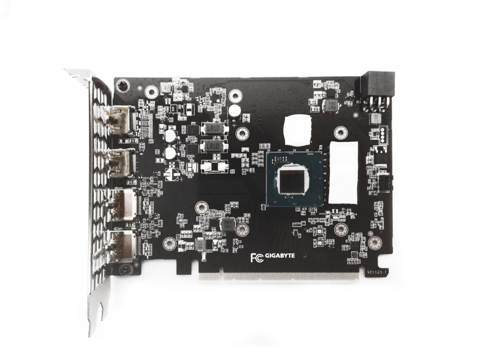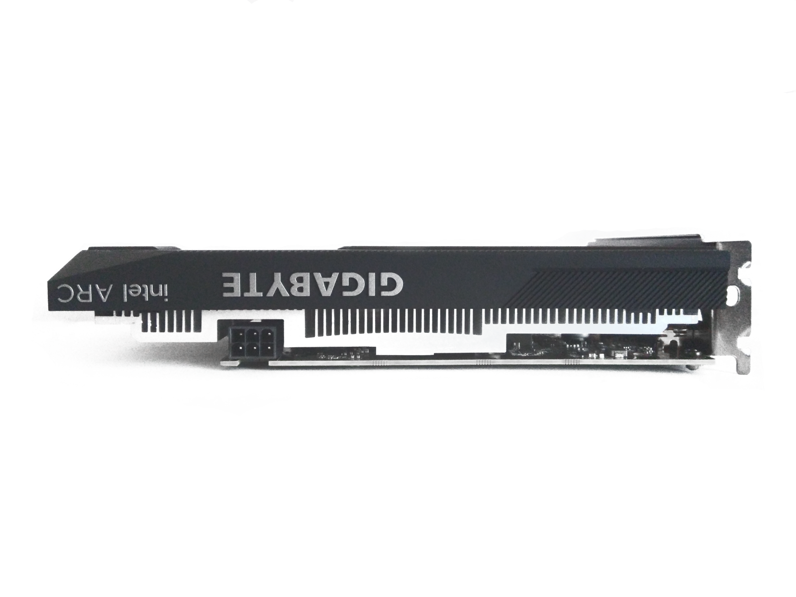 С боку приютился шестипиновый разъем дополнительного питания, присутствие которого на данной видеокарте, возможно, было излишним. Дело в том, что согласно Intel Arc Control, лимит энергопотребления GIGABYTE Intel Arc A380 WINDFORCE OC ограничен 66-ю ваттами, с чем явно справился бы слот PCI-E.