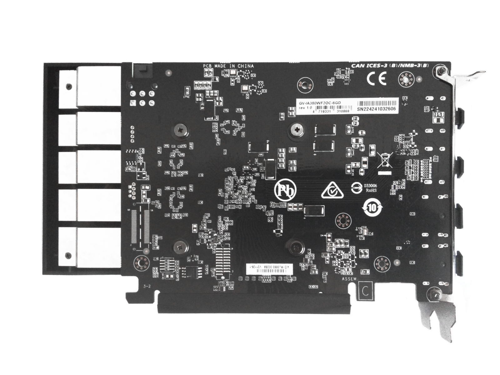 Помимо графического процессора ACM-G10, обозреваемая GIGABYTE Intel Arc A380 WINDFORCE OC несет на борту 6 ГБ памяти стандарта GDDR6, оборудована двумя портами HDMI и двумя DP. Основу системы охлаждения составляет брусок алюминия, массой 255-260 г. Вес самой видеокарты — 475-480 г. Два вентилятора диаметром 75 мм имеют функцию автоматической остановки при низкой температуре GPU, и их лопасти отзеркалены по отношению друг к другу. Подобную схему GIGABYTE именует Windforce 2, и заявляет, что она увеличивает эффективность охлаждения. Также на GIGABYTE Intel Arc A380 WINDFORCE OC имеется один разъем 6-pin. Мониторинг GPU-Z рапортует о наличии датчика температуры памяти, что практически не встречается в видеокартах AMD и NVIDIA младшего ценового диапазона.