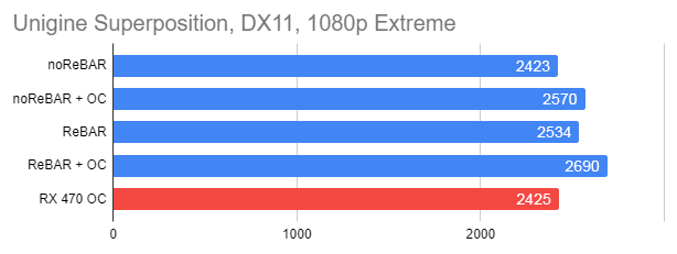 Постепенно становящийся классическим бенчмарк Unigine Superposition показывает, что Arc A380 по производительности примерно аналогична Radeon RX 470, представителю архитектуры GCN в четвертой инкарнации. В разгоне и с активированным Resizable BAR новинка опережает "старушку" более чем на 10%. Отсутствие ReBAR приводит к 4,5%-му замедлению, а разгон — к ускорению на 6%.