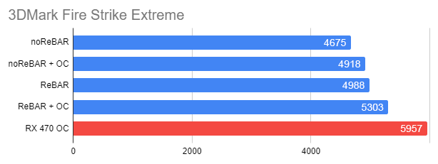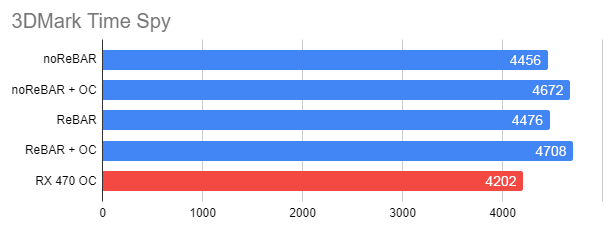 И, как видно, дополнительные возможности DirectX12 Ultimate сильно зависят от технологии Resizable Bar, и в случае ее отсутствия или деактивации скорость рендеринга снижается на 24%, а с учетом разгона — на 27%. Radeon RX 470 ожидаемо не смогла запустить тест из-за отсутствия поддержки DirectX12 Ultimate.