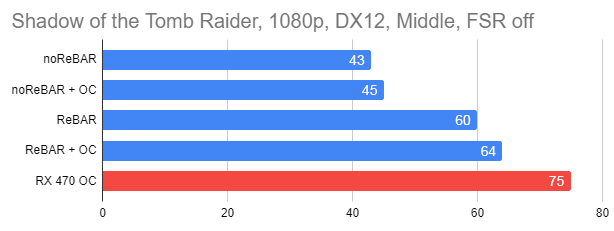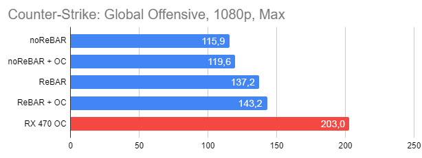 Несмотря на использование DirectX 12, Radeon RX 470 чувствует себя более уверенно, опережая Arc A380 на 17%. Впрочем, отставание не сильное, и достигнутая Arc A380 производительность с активированным Resizable BAR все равно достаточно высока. А вот 40%-ое снижение количества кадров в секунду без его активации явно показывает, насколько все же важна поддержка данной функции в системе.