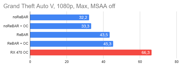 GTA V явно не та игра, ради которой стоит покупать Intel Arc, по крайней мере, до выхода второй серии — Battlemage, анонс которой может состояться уже в этом году. И уж тем более обладателям систем, на которых невозможна активация Resizable BAR. Без него отставание от RX 470 становится двукратным, а с включенным Resizable BAR оно составляет "всего" 46%.