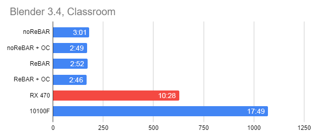 В качестве бонуса прилагаются результаты рендеринга 3D-сцены Classroom в Blender 3.4 с использованием GPU. В последних версиях Blender'а встроенный визуализатор Cycles обзавелся поддержкой oneAPI, таким образом, видеокарты Intel Arc могут использоваться для ускорения просчета сцены. Для AMD был интегрирован API ROCm, но он, к сожалению, требует наличия GPU с архитектурой GCN 5.0 и выше. Поэтому рендеринг на Radeon RX 470 был произведен в Blender версии 2.93 с задействованием API OpenCL. Поскольку визуализация нагружает видеокарту по полной, то разгон не самого топового экземпляра данного видеоадаптера приводил к зависанию системы. Так что тестирование рендеринга на Radeon RX 470 было проведено в стоковом режиме. В целом, применение Arc A380 позволило сократить время просчета сцены относительно Core i3-10100F примерно в 6 раз, приблизившись к результатам, демонстрируемым последними флагманскими процессорами.
