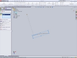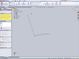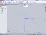 Теперь создайте второй эскиз на плоскости "сверху" и проведите на нём осевую линию, начинающуюся от одной из точек сплайна и идущую перпендикулярно плоскости первого эскиза. Выставьте длину лини чуть больше чем редполагаемая длина будущей лопасти.