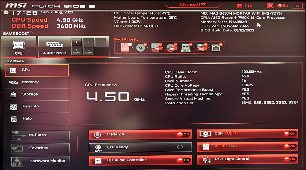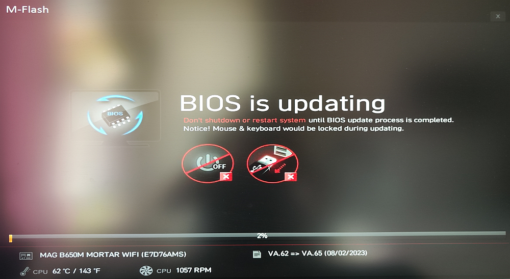И вот, почти спустя месяц с момента покупки, во время плановой разборки системного блока для его чистки, я установил последнюю доступную версию BIOS, которая вроде как увеличивает верхний предел разгона оперативной памяти на процессорах AMD 7000 линейки, очистил CMOS и установил новые модули.