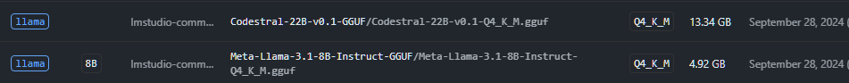 Пока я скачал две модели: Meta Llama 3.1 8B и Codestral-22B-v0.1-GGUF
