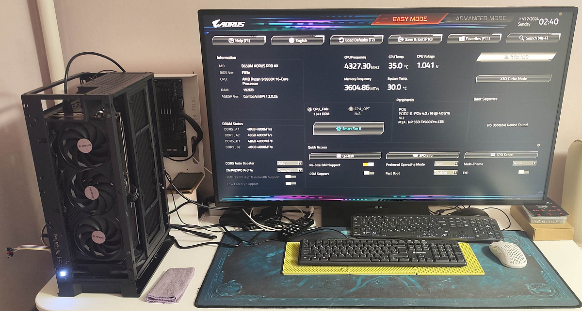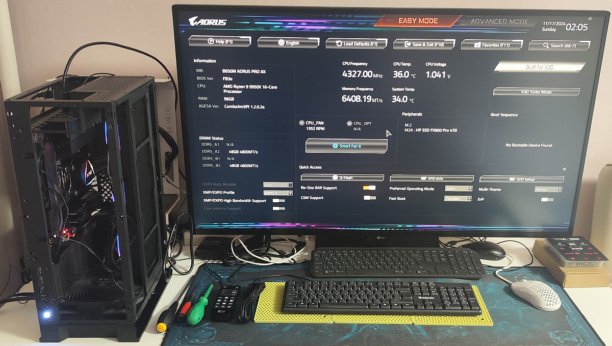 Затем я установил последний BIOS (FB3e от 2024-11-13 с AGESA 1.2.0.2a) и собрал ПК без видеокарты и с двумя модулями DDR5.