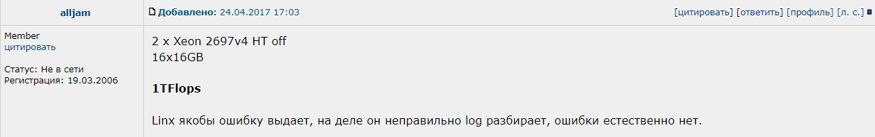 Он указал на то, что LinX выдаёт ошибку, когда производительность превышает один триллион операций с плавающей запятой в секунду (1 TFlops = 1000 GFlops).