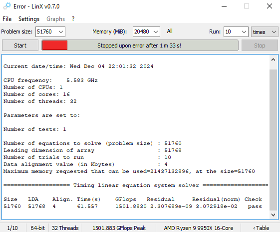 Долгое время я использовал LinX для тестирования стабильности работы компьютеров при разгоне. Он очень быстро выявлял нестабильную работу системного блока. В частности, я использовал его, чтобы найти максимальную стабильную частоту четырёх модулей ОЗУ на платформе с процессором AMD Ryzen 9 7950X. А с недавних пор и для тестов новой платформы с AMD Ryzen 9 9950X.