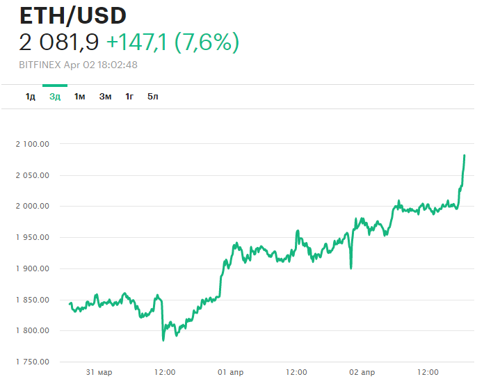 | 7 | Курс Ethereum сегодня обновил исторический максимум и достиг 2081 USD | Недавние стимулы оказали положительное влияние на рост курса эфира. Доходность майнинга находится на пиковых значениях. | 2 апреля 2021 |