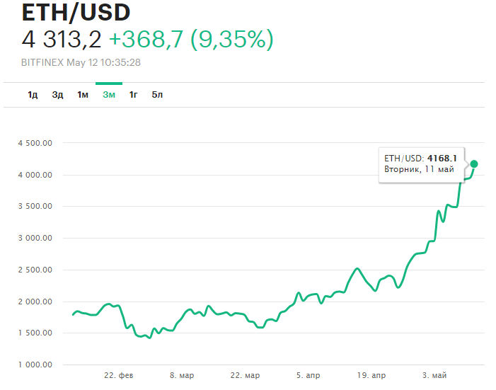 | 11 | Курс эфира штурмует новые высоты и уже достиг психологической отметки в 3500 USD | Курс эфира установил новый рекорд в 3507 USD за 1 монету. Потенциальная прибыль холдеров находится на исторических значениях. | 4 мая 2021 |