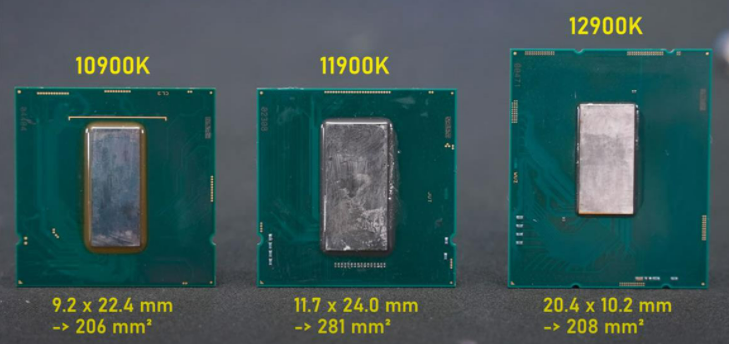 Размеры чипов процессоров Intel Core i9 10900K, 11900K и 12900K