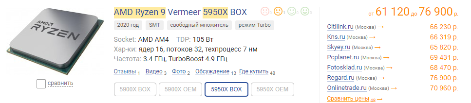 Стоимость процессора AMD Ryzen 9 5950X на текущий момент составляет от 61 т.р. до 77 т.р. (в зависимости от магазина и способа оплаты).