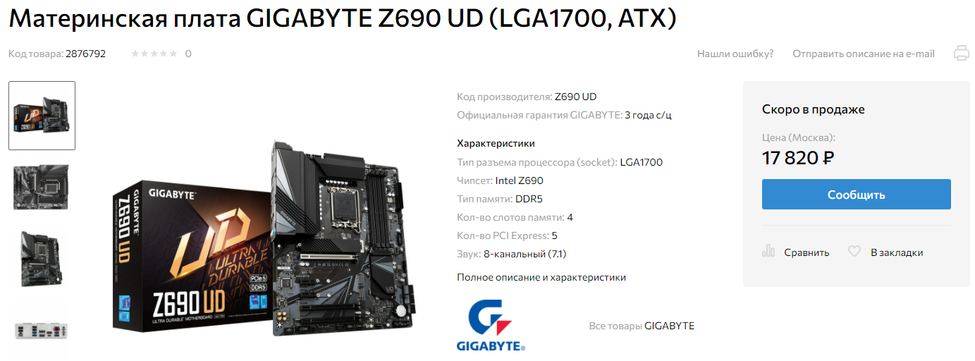 Ну а если Вы хотите ощутить всю мощь новой платформы Intel 12-го поколения, то необходимо также купить оперативную память стандарта DDR5 (от 11 т.р. за модуль объёмом 16 ГБайт) и соответствующую материнскую плату (например, GIGABYTE Z690 UD за 18 т.р.).