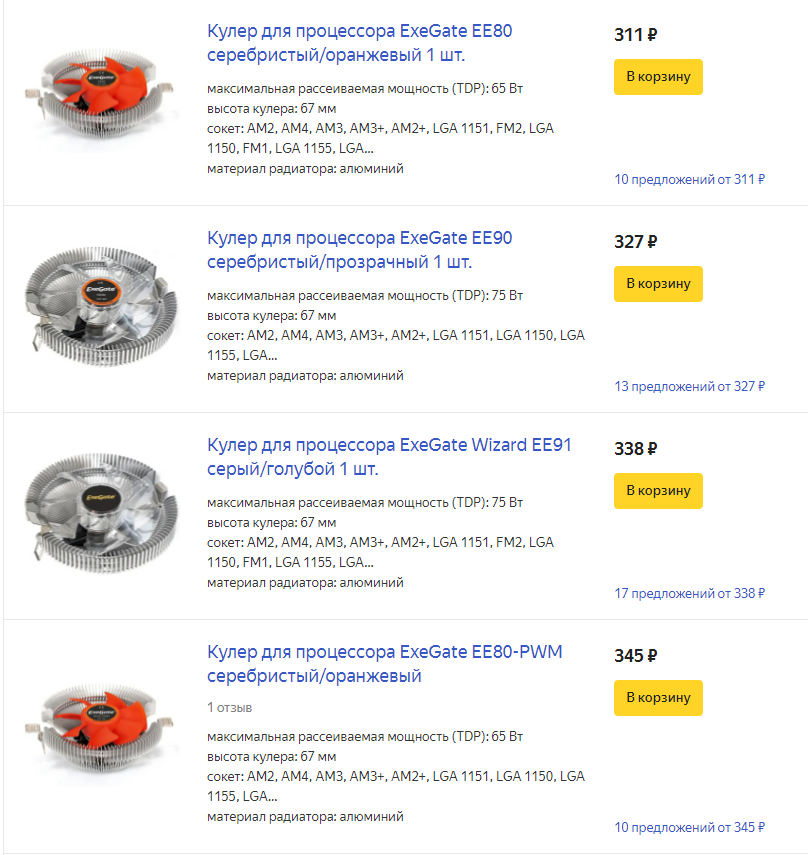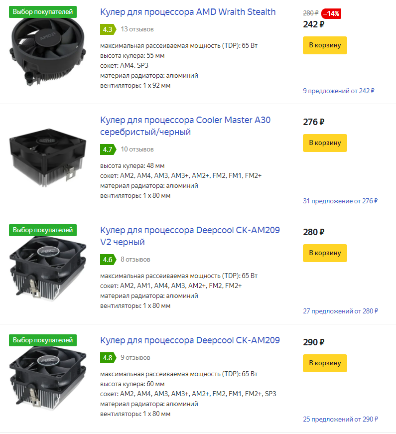 Начал изучать я вопрос с самых дешёвых кулеров под сокет AM4. В диапазоне цен от 270 до 300 рублей в наличии имеется несколько вариантов кулеров, сделанных из цельного куска алюминия. К сожалению их максимальная рассеиваемая мощность ограничена 65 Вт, поэтому их я пропустил.