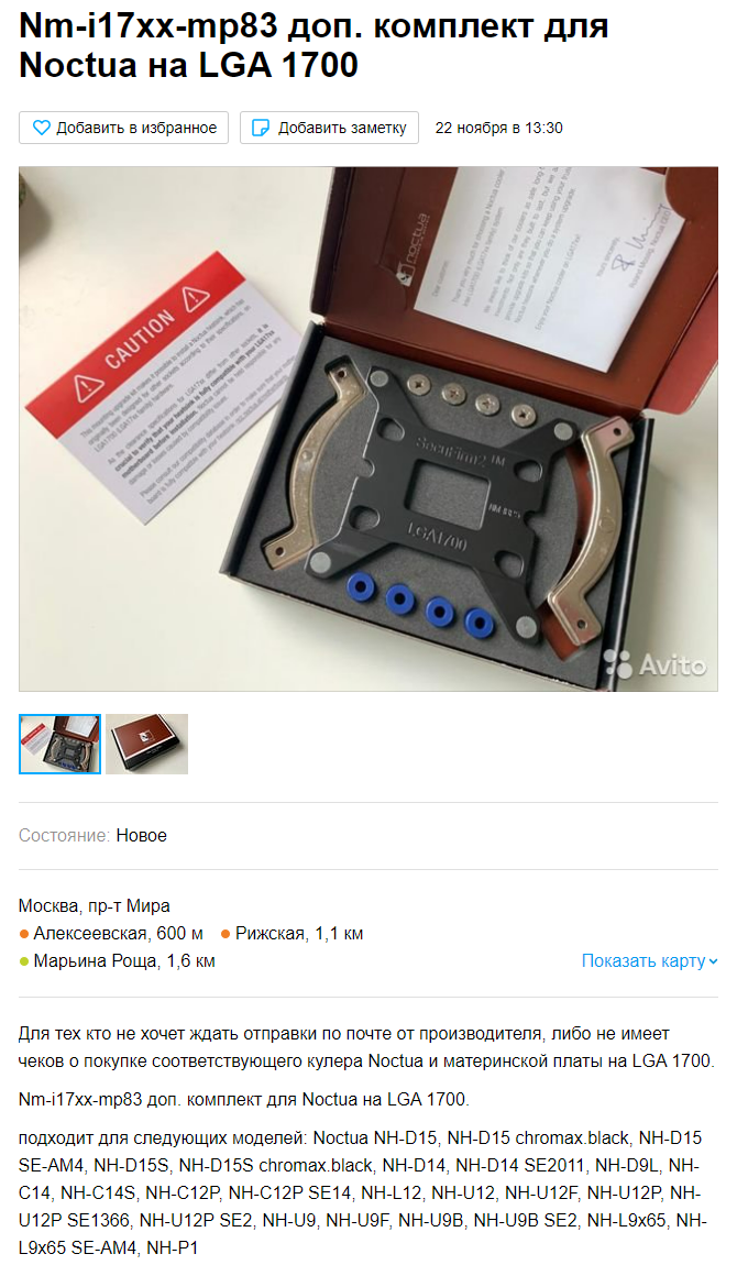 Поэтому, руководствуясь поговоркой "старый конь борозды не испортит", я пошёл на Авито, нашёл б/у кулер Noctua NH-D14 без вентиляторов за 2500 рублей и заказал его. И пусть он не совместим с сокетом AM4 и у него нет вентиляторов в комплекте. Разных вентиляторов у меня много, а крепление под Socket AM4 для него я купил за 500 рублей.
