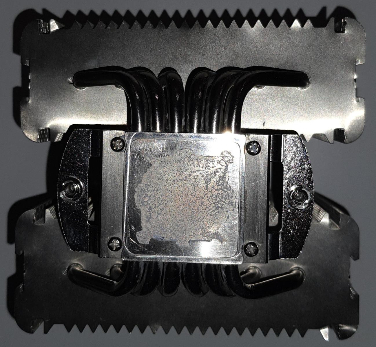 Я разобрал компьютер, демонтировал процессорный кулер и сфотографировал отпечатки термопасты.