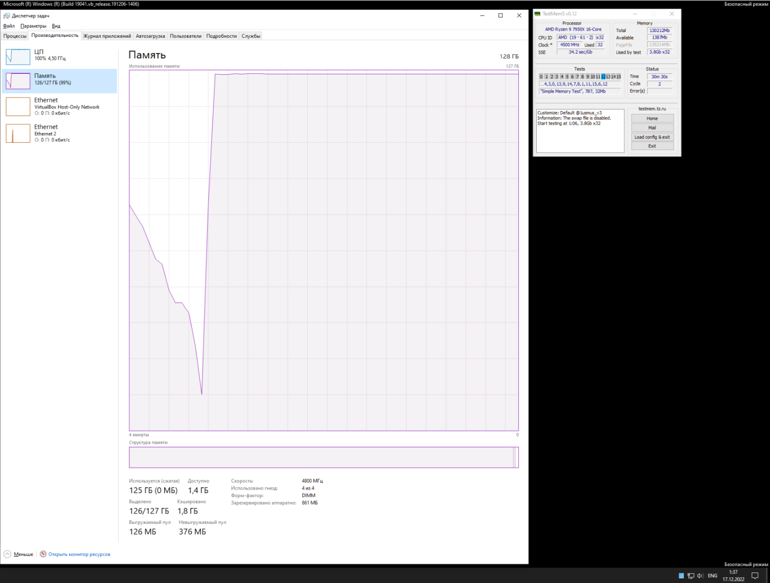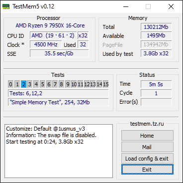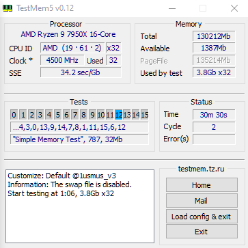 Полный тест 128 ГБ ОЗУ, с помощью TestMem5, занял примерно 28 минут.