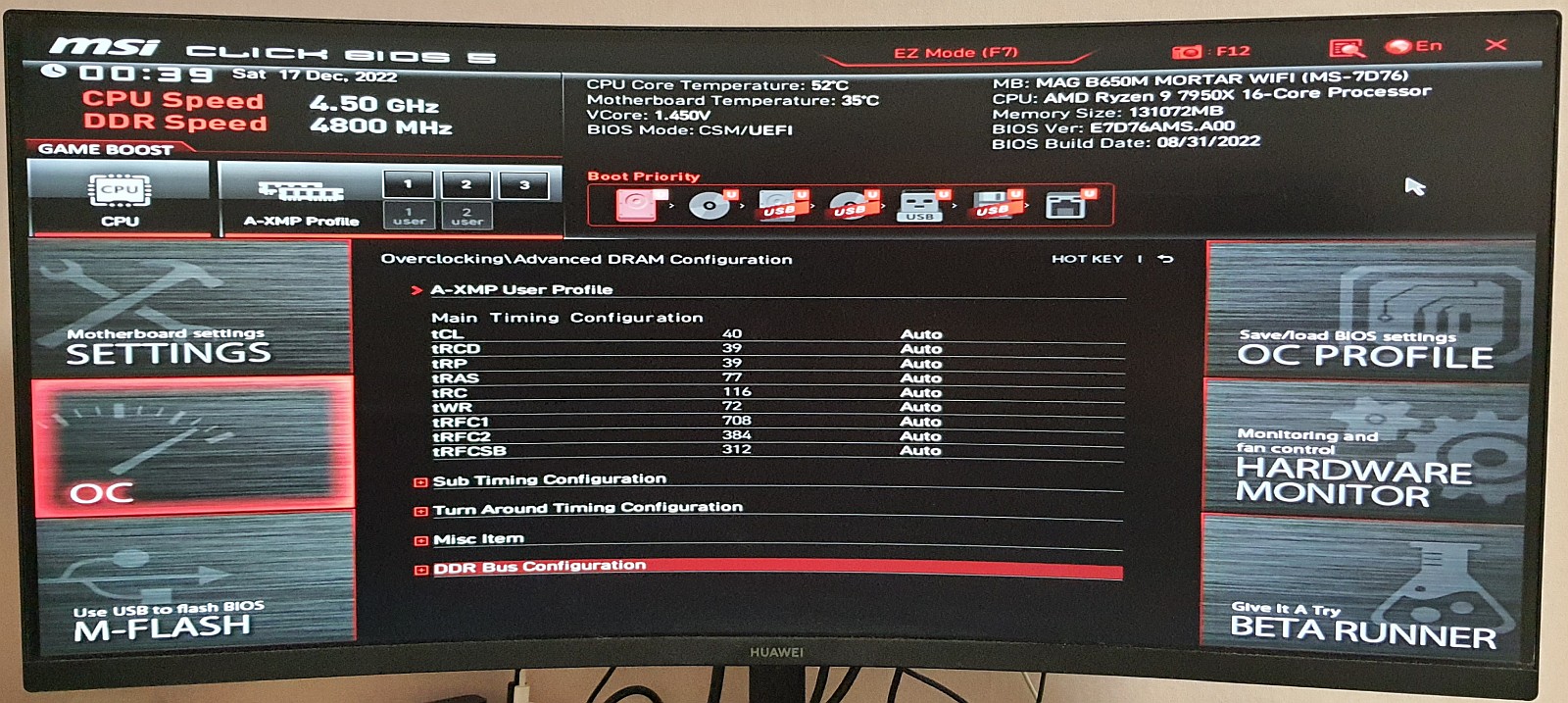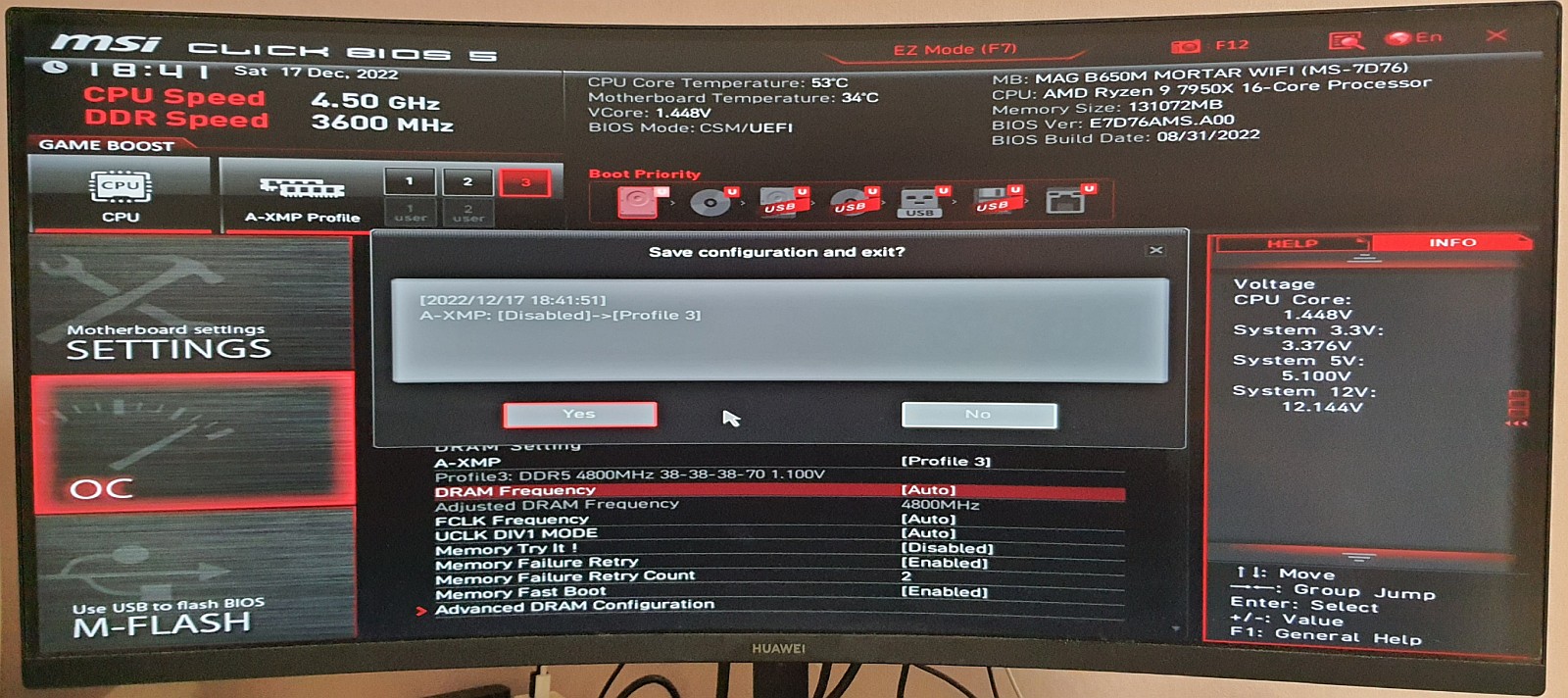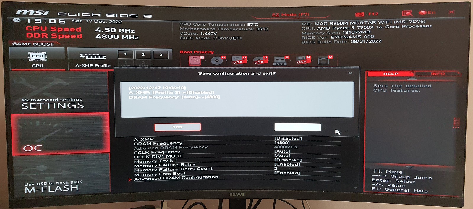 На этом моменте я подумал, почему бы не попробовать разогнать оперативную память. Напомню, что штатная частота оперативной памяти при использовании четырёх двухранговых модулей на платформе AMD Ryzen 7000-ой серии составляет 3600 МГц. Но из руководства к материнской плате MSI MAG B650M Mortar WiFi:
