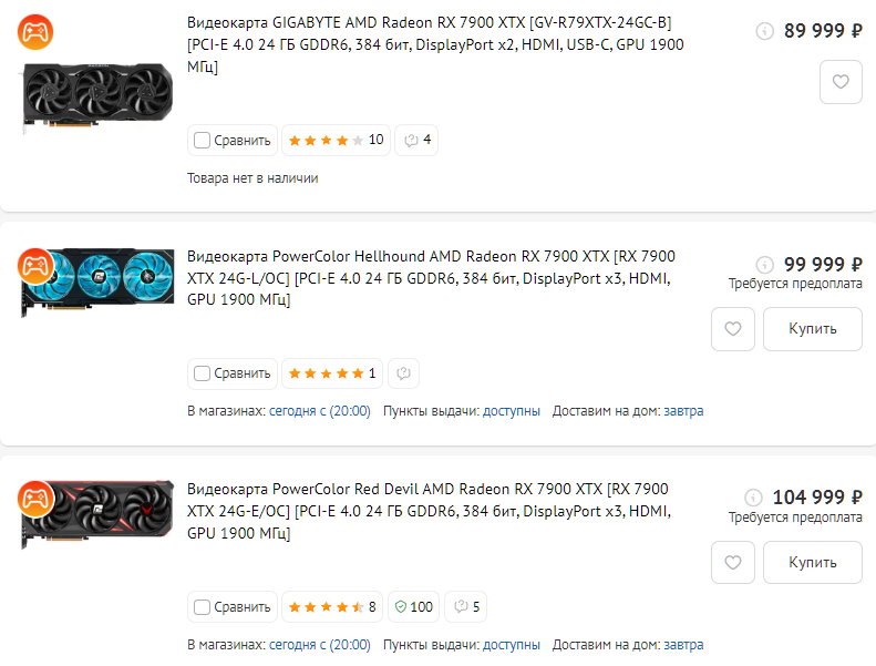 И в принципе такую цену за него и просят (за модель GIGABYTE AMD Radeon RX 7900 XTX), но в наличии их по этой цене нет, а есть гораздо более дорогие PowerColor Hellhound AMD Radeon RX 7900 XTX и PowerColor Red Devil AMD Radeon RX 7900 XTX: