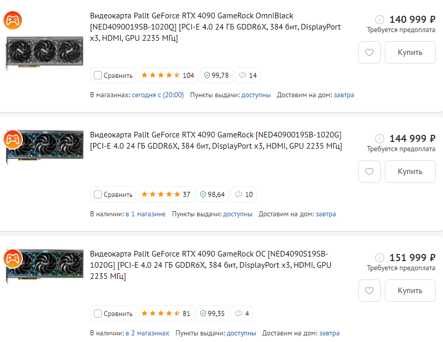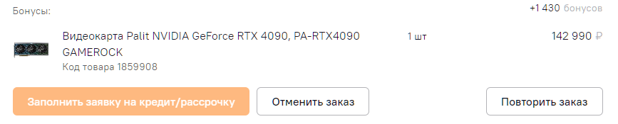 В результате сравнения различных вариантов, я остановил свой выбор на модели Palit NVIDIA GeForce RTX 4090, PA-RTX4090 GAMEROCK в Ситилинк в рассрочку на полгода за 24 тысячи рублей в месяц.