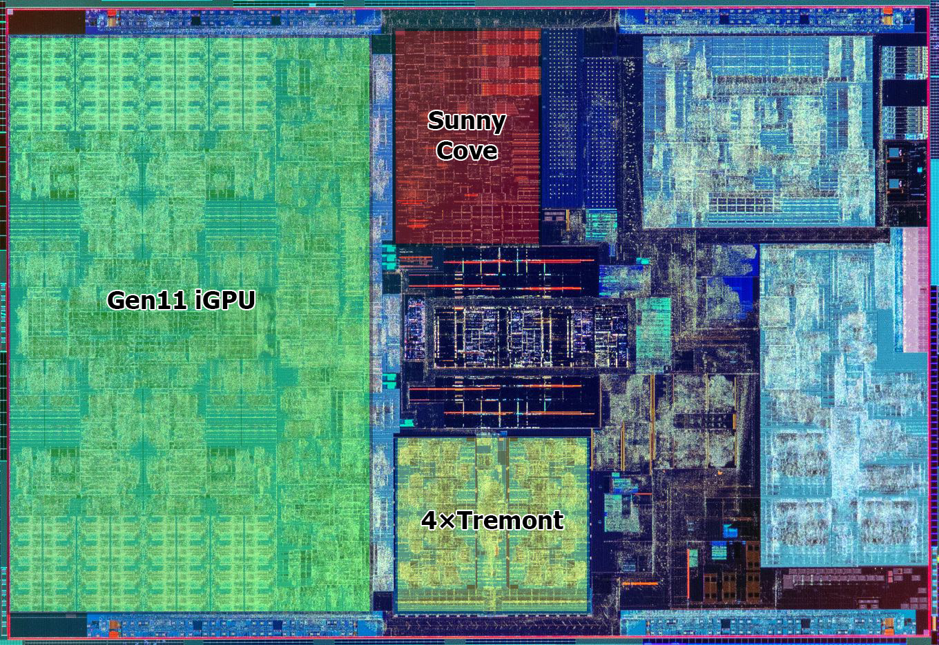 - У Intel же на момент выхода первой гетерогенной архитектуры проблемы были совсем иного рода — высокопроизводительное ядро, способное «потянуть» многие задачи даже в одиночку имелось, но оно содержало в себе столь огромное количество транзисторов, что даже при использовании передового 10-нм техпроцесса занимало слишком много места. На вычислительном кристалле Lakefield площадью 82 мм2 с учётом присутствия на нём графического процессора 11 поколения, 4 «малых» ядер Tremont и некоторых других блоков, попросту нет места для второго «большого» ядра Sunny Cove. Даже если физически удалить из ядра Sunny Cove неиспользуемые в Lakefield блоки, исполняющий AVX-инструкции и соответствующие регистры.